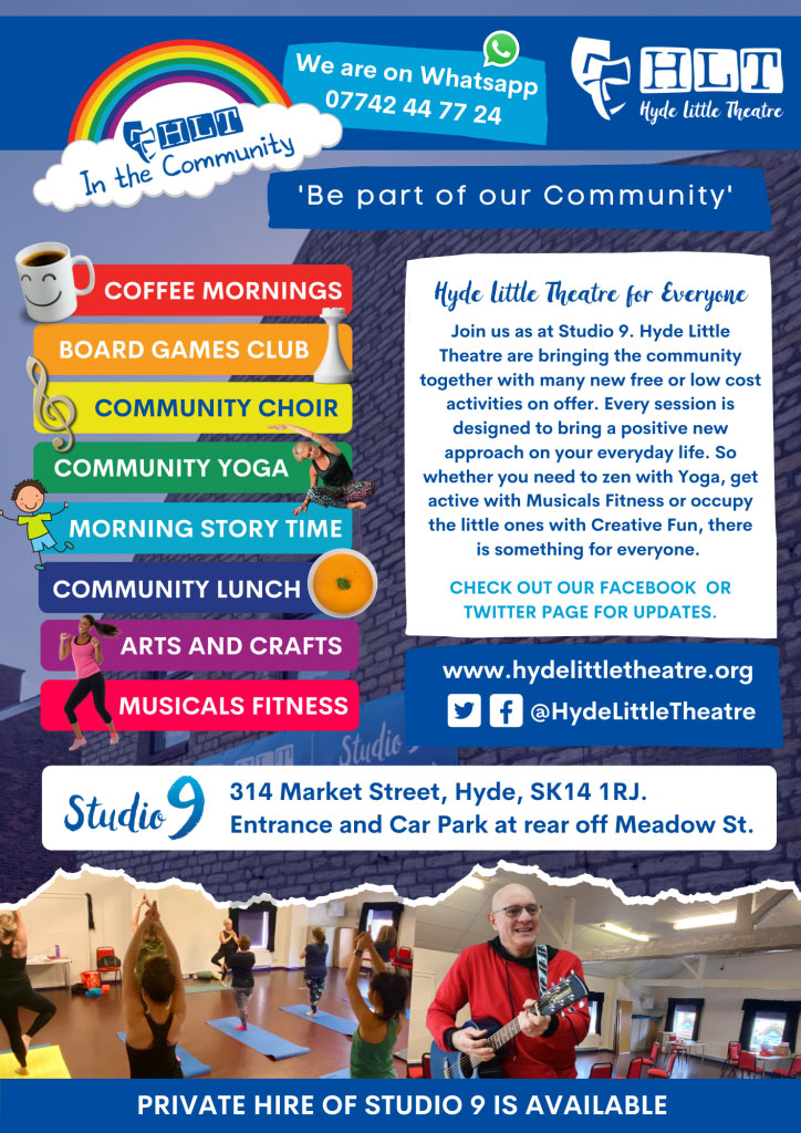Hyde Little Theatre are extremely proud to be part of the local community of Tameside and beyond. As an amateur dramatic society performing in local theatre is what we best, with an annual family pantomime and seasonal plays. We are also committed to giving something back to our audiences, welcoming you to join us at Studio 9 for a selection of activities and events.